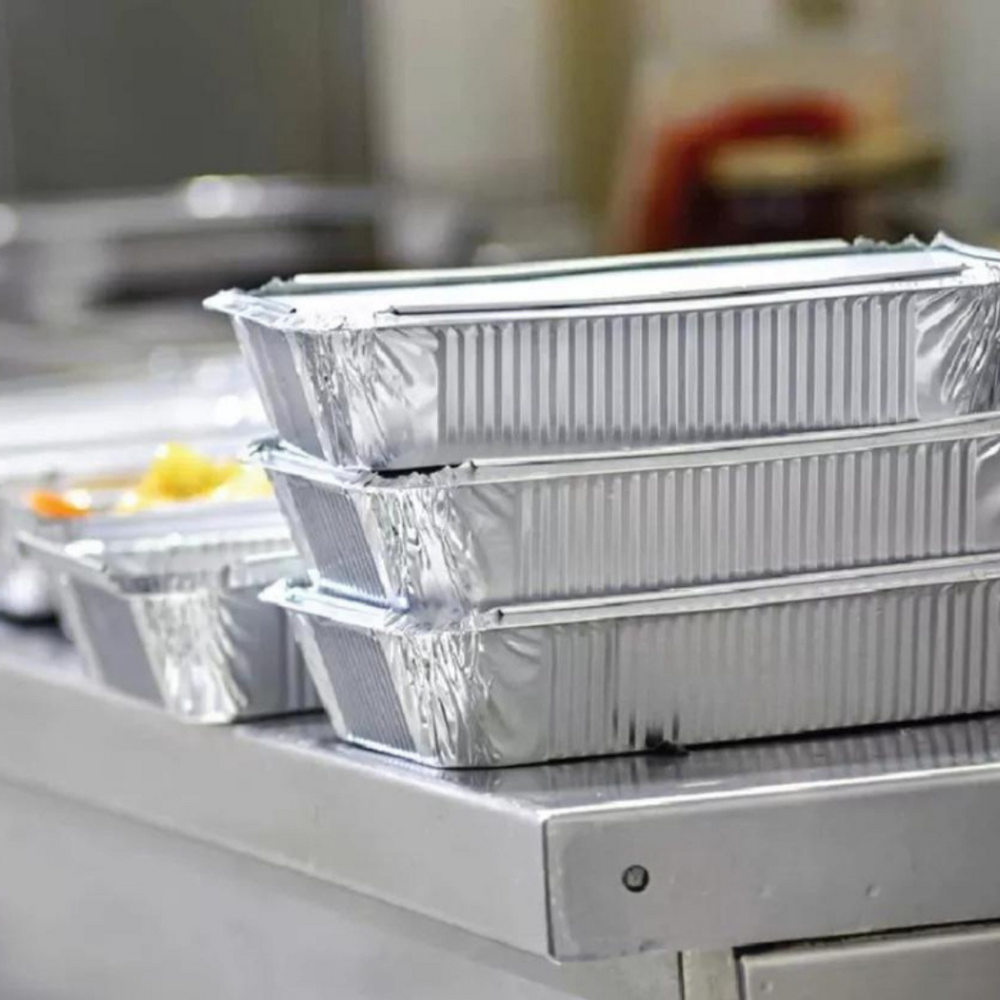 Envases rectangulares de aluminio resistentes y prácticos, ideales para preparaciones grandes, catering y delivery. Soportan horno, refrigerador y congelador, manteniendo la frescura y calidad de los alimentos.