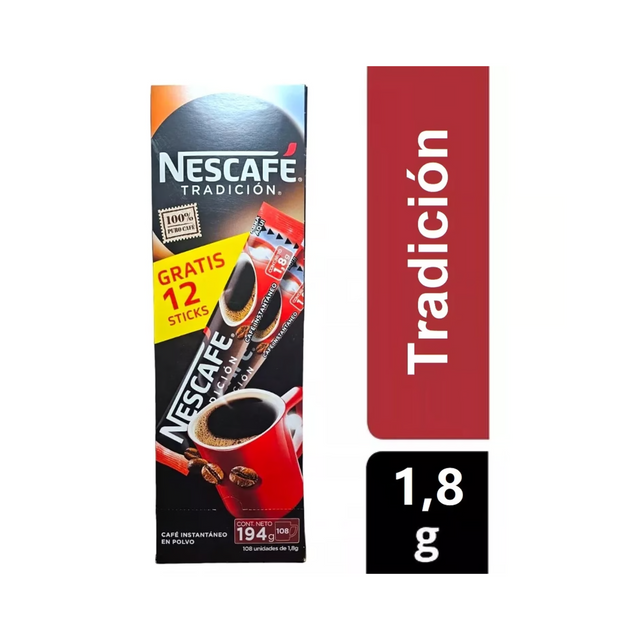 Disfruta del sabor intenso y clásico de Nescafé Tradición en formato stick individual de 1,8 g cada uno, ideal para preparar una taza rápida de café soluble en cualquier lugar. Esta presentación contiene 96 sobres por caja (contenido neto aproximado: 172,8 g).
