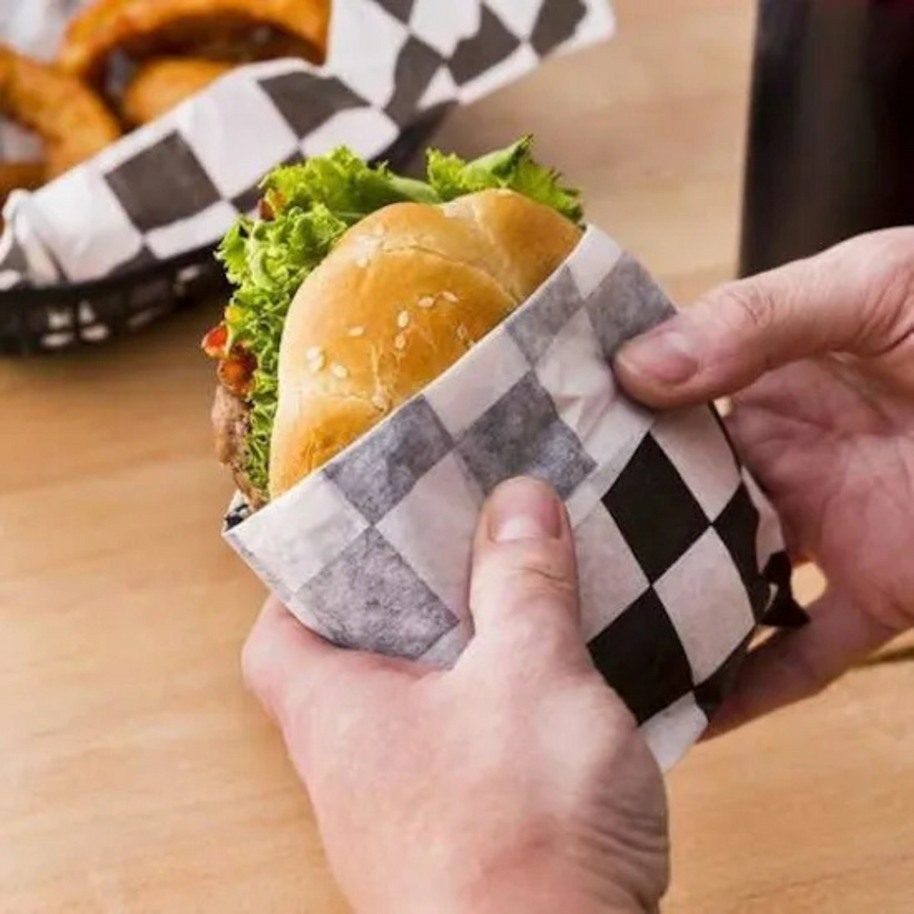 Papel antigrasa de 30 x 30 cm con diseño ajedrez negro, ideal para envolver y presentar alimentos de manera higiénica y con estilo. Su recubrimiento especial evita filtraciones de grasa o aceite, manteniendo la frescura y la textura de los productos por más tiempo. Perfecto para hamburguesas, sándwiches, papas fritas, empanadas, wraps, hot dogs y todo tipo de comida rápida.