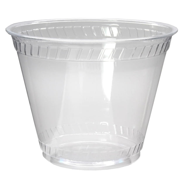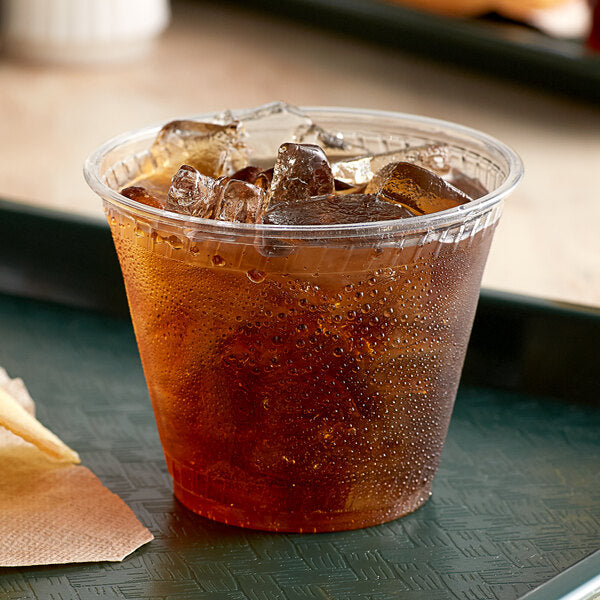 Vaso de plástico PET transparente, capacidad 270 cc (9 oz). Resistente, elegante y práctico, ideal para jugos, cócteles, whisky y bebidas frías.
